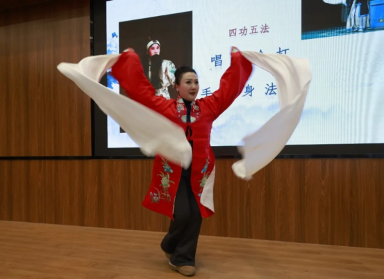 在互动环节中,王荔教学生学习水袖,逐一纠正姿态,手把手指导要领,鼓励大家上台体验角色扮演,还结合学生现场演绎,亲自示范,纠正发声方式。